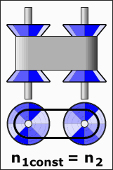 As the distance between the pulleys and the length of the belt does not change, both pulleys must be adjusted (one bigger, the other smaller) simultaneously in order to maintain the proper amount of tension on the belt. Simple CVTs combining a centrifugal drive pulley with a spring loaded driven pulley often use belt tension to effect the conforming adjustments in the driven pulley.[2] The V-belt needs to be very stiff in the pulley's axial direction in order to make only short radial movements while sliding in and out of the pulleys.