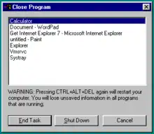 | Windows 9x | Ctrl+Alt+Delete | Bring up "Close Program" dialog box (a simplistic task manager). Performs a soft reboot if pressed twice.[19][20] |
