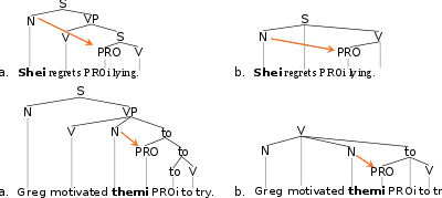 Theoretical linguistics posits the existence of the null pronoun PRO as the theoretical basis for the analysis of control structures. The null pronoun PRO is an element that impacts a sentence in a similar manner to how a normal pronoun impacts a sentence, but the null pronoun is inaudible.[6] The null PRO is added to the predicate, where it occupies the position that one would typically associate with an overt subject (if one were present). The following trees illustrate PRO in both constituency-based structures of phrase structure grammars and dependency-based structures of dependency grammars:[7]