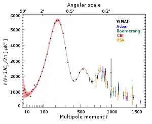 Inspired by the COBE results, a series of ground and balloon-based experiments measured cosmic microwave background anisotropies on smaller angular scales over the next decade. The primary goal of these experiments was to measure the scale of the first acoustic peak, which COBE did not have sufficient resolution to resolve. This peak corresponds to large scale density variations in the early universe that are created by gravitational instabilities, resulting in acoustical oscillations in the plasma.[39] The first peak in the anisotropy was tentatively detected by the Toco experiment and the result was confirmed by the BOOMERanG and MAXIMA experiments.[40][41][42] These measurements demonstrated that the geometry of the universe is approximately flat, rather than curved.[43] They ruled out cosmic strings as a major component of cosmic structure formation and suggested cosmic inflation was the right theory of structure formation.[44]