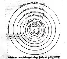 The idea of celestial spheres was developed in the cosmological models of Plato, Eudoxus, Aristotle, Ptolemy, Copernicus, and others.[17] They believed in a stable cosmos created by God, where distinct realms were subject to different kinds of order. Europeans maintained the Aristotelian view that infinity could only be seen as an attribute of God, with the cosmos being finite. Furthermore, following the Aristotelian view that "nature abhors a vacuum", Europeans believed that the space between the spheres were filled with air.[16] This theory persisted until the Scientific Revolution, when the discovery that the Sun was in the center of the planetary system rocked cosmological understanding to its core.
