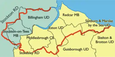 | Eston Urban District† (most) | 1,873 acres (7.58 km2) | Remaining 218 acres (0.88 km2) passed to Guisborough UD |