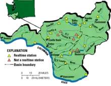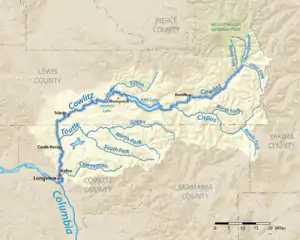 The Cowlitz has a 2,586-square-mile (6,698 km2) drainage basin,[5][6] located between the Cascade Range in eastern Lewis County, Washington and the cities of Kelso and Longview. The river is roughly 105 miles (169 km) long, not counting tributaries.