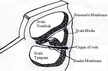 The human ear is made up of three areas: the outer, middle and inner ear. Within the inner ear sits the cochlea. The cochlea is a snail-shaped formation that enables sound transmission via a sensorineural route, rather than through a conductive pathway.[11] The cochlea is a complex structure, consisting of three layers of fluid. The scala vestibuli and scala media are separated by Reissner's Membrane whereas the scala media and scala tympani are divided by the basilar membrane.[11] The diagram below illustrates the complex layout of the compartments and their divisions:[4]