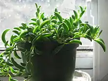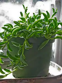Curio radicans,[1] syn. Senecio radicans, is a succulent houseplant that is native to South Africa. A member of the family Asteraceae, the asters, this species is closely related to the common String of Pearls and Curio hallianus. It has multiple tendrils of glossy, banana-shaped foliage. It is commonly known as string of bananas.
