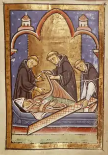 ![]() Cuthbert discovers a piece of timber, from a 12th-century manuscript of Bede's Life of St. Cuthbert | |