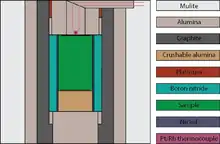 Another design element that can be included into the sample assembly is a thermocouple. Thermocouples can be placed either as side entry (one that enters the center of the cube from and edge) or can be a top entry thermocouple (one that enters the top face). In the case of the top entry thermocouple, it can be simultaneously be used as the top piston, but the temperature is being read far from the sample center. The side entry thermocouple reads the temperature closer to the sample center, but the placement usually involves a hole to be drilled in the middle of the furnace, altering the heating characteristics of the furnace. To avoid both downside associated with wither thermocouple some sample assemblies do not use a thermocouple; temperature is instead either calibrated from the relationship of watts vs. temperature or calculated using the known pressure and calculated sample volume from in-situ x-ray diffraction data.[3]