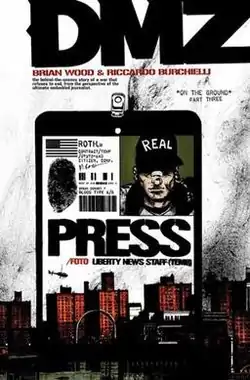 ![]() Cover art by Brian Wood or DMZ issue #3 – the third part of the "On the Ground" arc – featuring the press pass of protagonist Matty Roth above the Manhattan skyline | |