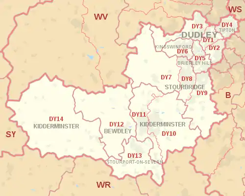 The DY postcode area, also known as the Dudley postcode area,[2] is a group of fourteen postcode districts in England, within eight post towns. These cover the south-western part of the West Midlands (including Dudley, Tipton, Brierley Hill, Stourbridge and Kingswinford) and north Worcestershire (including Kidderminster, Bewdley and Stourport-on-Severn), plus the south-westernmost part of Staffordshire and a small part of south-east Shropshire.