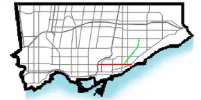![]() Map of Danforth Avenue (Red) and Danforth Road (Green) within Toronto | |||||||