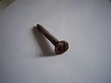Date nails were tagging devices utilized by railroads to visually identify the age of a railroad tie. Octave Chanute, railroad and aviation pioneer, is credited with the idea for using date nails as a way of tracking the life of railroad ties.[1] Different railroads used different sized nails with either alpha or numerical markings. An example would be a Southern Pacific Railroad nail with the marking "01" stamped on the head of the nail. The "01" would identify the nail as being hammered into a railroad tie in the year 1901.[2]