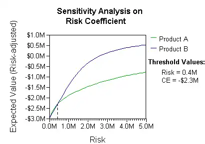 The basic interpretation in this situation is that the company prefers B's risk and payoffs under realistic risk preference coefficients (greater than $400K—in that range of risk aversion, the company would need to model a third strategy, "Neither A nor B").