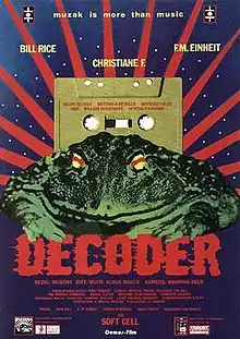 Decoder is a 1984 West German film directed by Muscha. It is a cyberpunk and counter-cultural film roughly based on the writings of William S. Burroughs, who also acts in the film.[2] Bill Rice plays Jaeger ("Hunter"), an agent of the government in charge of suppressing dissidents, while FM Einheit plays a burger shop employee who discovers that by changing the background music from pleasantly calming to industrial "noise" music, he can incite riots and a revolution against the looming power of the government.