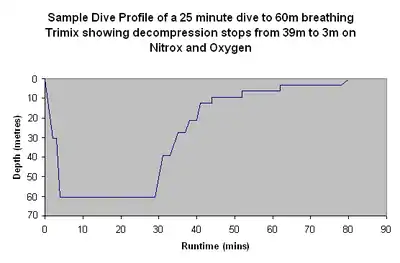 A decompression schedule is a specified ascent rate and series of increasingly shallower decompression stops—often for increasing amounts of time—that a diver performs to outgas inert gases from their body during ascent to the surface to reduce the risk of decompression sickness. In a decompression dive, the decompression phase may make up a large part of the time spent underwater (in many cases it is longer than the actual time spent at depth).[18]