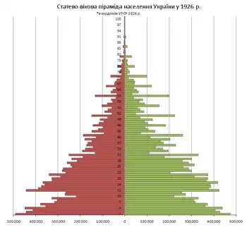 The famines of the 1930s, followed by the devastation of World War II, created a demographic disaster. Life expectancy at birth fell to a level as low as ten years for females and seven for males in 1933 and plateaued around 25 for females and 15 for males in the period 1941–44.[13] According to The Oxford companion to World War II, "Over 7 million inhabitants of Ukraine, more than one-sixth of the pre-war population, were killed during the Second World War."[14]