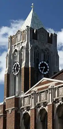 Perhaps the most iconic feature of the Denfeld High School building is its 120-foot clock tower. The tower features eight buttresses. Its face was designed by Carl Shroer, a teacher at Central High School, and was completed by Denfeld students who welded together four sections cast in aluminum by the Duluth Brassworks Company. The numbers on the face were painted silver and the clock hands were gold painted wood. The face was later painted black to be easier read from Grand Avenue.