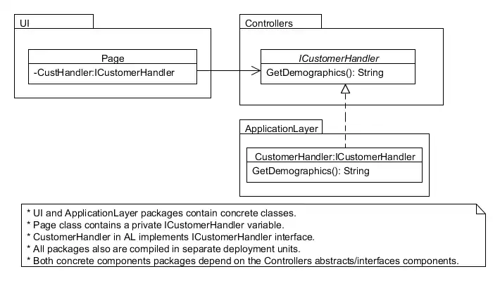 UI and ApplicationLayer packages contains mainly concrete classes. Controllers contains abstracts/interface types. UI has an instance of ICustomerHandler. All packages are physically separated. In the ApplicationLayer there is a concrete implementation that Page class will use. Instances of this interface are created dynamically by a Factory (possibly in the same Controllers package). The concrete types, Page and CustomerHandler, don't depend on each other; both depend on ICustomerHandler.