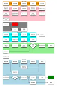 "Deployment flowcharts consist of a sequence of activity steps and also the interactions between individuals or groups."[1] Each participant in the process is displayed on the map (which is constructed as a matrix) - tasks/activity are then articulated in sequence under the column corresponding to that stakeholder.