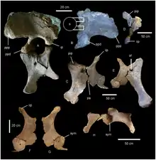 The left ilium, left and right pubes, left and right ischia, and entire right leg lacking the foot are preserved for Diamantinasaurus, although some bones are highly fragmented and poorly preserved. The ilium has the outside well preserved, but its size and fragility mean the internal side cannot be seen for anatomical features. The top edge of the ilium is broken, revealing numerous small internal camerae, as present in the titanosaurs Alamosaurus, Epachthosaurus, Lirainosaurus, Saltasaurus and Sonidosaurus. Shared with other derived titanosaurs, the anterior process of the ilium flares to the side and rotates so the vertical ilium body becomes a horizontal shelf. Diamantinasaurus also displays the derived sauropod traits of a rounded ilium, reduced articular surface for the ischium, and a protuberance above the ischiatic articulation (only shared with Opisthocoelicaudia among Titanosauriformes). The pubis, as in advanced sauropods, is a flattened bone, lacking the anterior hook of diplodocoids, but with potentially autapomorphic grooves surrounding the obturator foramen. Articulation with the ischium takes up 46% of the pubic length, as in most macronarians but contrasting with Alamosaurus and Opisthocoelicaudia, where it is reduced. The entire ischium is only 68% of the length of the pubis as in other titanosaurs, and also expands medially so the entire floor of the pelvis is closed. Unlike some titanosaurs, the ischium of Diamantinasaurus displays no constriction of its width, nor a flange projecting internally. Diamantinasaurus also lacks a notable muscle scar for the M. flexor tibialis internus 3 on the side of the distal ischium, which is diagnostic for the taxon amongst Neosauropoda.[1]