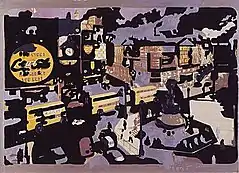 Roth had started to compulsively paint over postcards in the early sixties, explaining that it was easier to paint over printed objects than blank canvases; one of his most famous works, 96 Piccadillies, 1977, grew out of this compulsion, having as its starting point Roth's encounter with the collection of postcards of Piccadilly Circus owned by Richard Hamilton and his wife Rita Donagh.[38] Initially, six of these cards were printed as a large scale portfolio in 1970; eventually, in 1977, 96 of these altered Piccadillies were collected in a book, including the unaltered backs, with cut marks to allow the buyer to re-use them as postcards.