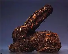 Gartenskulptor (Garden Sculpture), for instance, had started out as a copy of the multiple P.O.TH.A.A.VFB, a self-portrait bust made of chocolate and birdseed standing on a bird-table, exposed to the elements. Referred to by Roth as a 'dis- and re-assembly object',[40] each new incarnation gradually acquired working drawings, paintings, sculpted rabbits and collages placed on trellises in collector's gardens. It even acquired a real rabbit and the rabbit's hutch for a number of years. The last time it was installed in a garden was in 1989. When it was exhibited indoors in Switzerland, 1992, Gartenskulptor took up an entire room. By 1995 it was 20m long and included all sorts of objects including a fire ladder and television screens. By 2000, in Mönchengladbach, it was 40 metres long, having acquired elements from each of the installations' incarnations, including pebbly earth excavated by the architects Herzog and de Meuron for the facade of the Schaulager, for instance. The rabbit was no longer present.