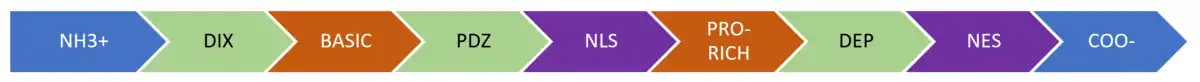 There are five main highly conserved regions that exist in all variations of DVL. These include an amino-terminal DIX (N-terminus) domain, a PDZ (central) domain, a carboxyl-terminal DEP (C-terminus) domain, and two regions with positively charged amino acid residues.[3] There is a proline-heavy region between the DIX and PDZ domains, and a largely basic region between the DIX and PDZ domains that has conserved serine and threonine residues. These regions mediate protein-protein interactions and help DVL channel signals into either the β-catenin or the β-catenin independent pathways.[3] Additionally, there is the conserved nuclear export sequence (NES) and a nuclear localization sequence (NLS), whose ability to move DVL between the cytoplasm and the nucleus may be an important part of its function.[3]