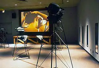 Cypis's later efforts, informed by her work with Kulture Klub Collaborative, turned from the gendered body to broader conceptions invoking history, memory, space and geopolitics.[28][3][2] Framing Memories I Never Had (1998) interwove images of catastrophe (e.g., the Holocaust) and poetic intimacy in a cinema-like slideshow of overlapping frames, double projections and white-out dissolves.[50][51] Other works used recurrent elements—mirrors and tactile, highly associative materials like feathers, raw sheep fleece and plywood—to create visually disorienting, ambiguous spaces and engage the body on social, psychological and phenomenological levels.[3][52] The installations Out of Time (1998–2000) and Angel of Histories (2000) explored movement, ephemerality, mortality and human form, reproducing spectators' reflections through distorting mirrors, video feeds and scales that placed them both inside and outside the work.[52][51][36]