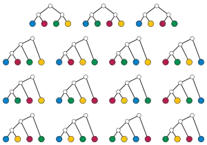 - Rooted binary trees with n + 3/2 labeled leaves. This case is similar to the unrooted case, but the number of edges that can be subdivided is even, and in addition to subdividing an edge it is possible to add a node to a tree with one fewer leaf by adding a new root whose two children are the smaller tree and the new leaf.[2][9]