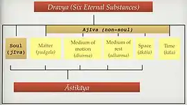Dravya (Sanskrit: द्रव्य) means substance or entity. According to the Jain philosophy, the universe is made up of six eternal substances: sentient beings or souls (jīva), non-sentient substance or matter (pudgala), principle of motion (dharma), the principle of rest (adharma), space (ākāśa) and time (kāla).[1][2] The latter five are united as the ajiva (the non-living). As per the Sanskrit etymology, dravya means substances or entity, but it may also mean real or fundamental categories.[2]