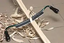 A drawknife (drawing knife, draw shave, shaving knife)[1] is a traditional woodworking hand tool used to shape wood by removing shavings. It consists of a blade with a handle at each end. The blade is much longer (along the cutting edge) than it is deep (from cutting edge to back edge). It is pulled or "drawn" (hence the name) toward the user.