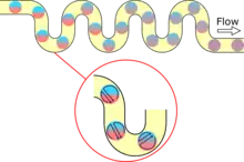 The benefits of microfluidics can be scaled up to higher throughput using larger channels to allow more droplets to pass or by increasing droplet size.[25] Droplet size can be tuned by adjusting the rate of flow of the continuous and disperse phases, but droplet size is limited by the need to maintain the concentration, inter-analyte distances, and stability of microdroplets.[26] Thus, increased channel size becomes attractive due to the ability to create and transport a large number of droplets,[25] though dispersion[27] and stability of droplets[28] become a concern. Finally, thorough mixing of droplets to expose the greatest possible number of reagents is necessary to ensure the maximum amount of starting materials react.[25] This can be accomplished by using a windy channel to facilitate unsteady laminar flow within the droplets.[1]