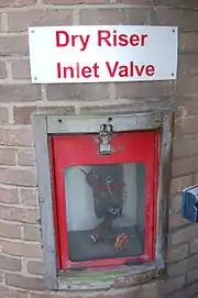 Most buildings have a "wet riser" or "wet standpipe" system where the pipes are kept full of water for manual or automatic fire fighting operations. Dry risers are used when the water pressure of a building wouldn't be enough for fire suppression and in unheated buildings where the pipes could freeze. In the UK, dry risers must allow fire engine access within 18 m of the dry riser inlet box.[1] Dry risers in occupied buildings must be within a fire-resistant shaft, usually one of a building's fire escape staircase enclosures. The riser is also where the gauges, valves, and alarm devices are located.