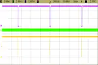 This is shown by the upper purple trace, the modulus control, A, counter output. These two screen captures differ only in the horizontal scale. The lower, yellow trace is the N counter output whose frequency corresponds to the channel spacing frequency of 30 kHz. The green trace is the output from the dual-modulus prescaler, which happens to correspond to 7.1714 MHz in the case that the prescaler is at 128 and 7.1158 when it is at 129. It is plainly obvious that the modulus control is low for precisely 6 cycles of the prescaler output. What is not obvious is the fact that the frequency changes by less than one percent between the two states of the modulus control. There will be cases where A = 0, resulting in the dual-modulus prescaler counting only by 128. This would happen at 906.24, 910.08, 913.92, 917.76, 921.60 MHz and so on.