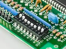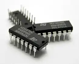 In microelectronics, a dual in-line package (DIP or DIL),[1] or dual in-line pin package (DIPP)[2] is an electronic component package with a rectangular housing and two parallel rows of electrical connecting pins. The package may be through-hole mounted to a printed circuit board (PCB) or inserted in a socket. The dual-inline format was invented by Don Forbes, Rex Rice and Bryant Rogers at Fairchild R&D in 1964,[3] when the restricted number of leads available on circular transistor-style packages became a limitation in the use of integrated circuits.[4] Increasingly complex circuits required more signal and power supply leads (as observed in Rent's rule); eventually microprocessors and similar complex devices required more leads than could be put on a DIP package, leading to development of higher-density chip carriers. Furthermore, square and rectangular packages made it easier to route printed-circuit traces beneath the packages.