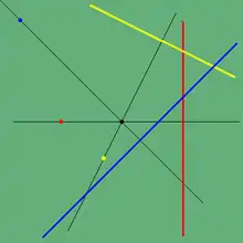 In order to turn this process into a correlation, the Euclidean plane (which is not a projective plane) needs to be expanded to the extended euclidean plane by adding a line at infinity and points at infinity which lie on this line. In this expanded plane, we define the polar of the point O to be the line at infinity (and O is the pole of the line at infinity), and the poles of the lines through O are the points of infinity where, if a line has slope s (≠ 0) its pole is the infinite point associated to the parallel class of lines with slope −1/s. The pole of the x-axis is the point of infinity of the vertical lines and the pole of the y-axis is the point of infinity of the horizontal lines.
