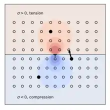 In metal alloys with substitutional solute elements, such as aluminum-magnesium alloys, dynamic strain aging leads to negative strain rate sensitivity which causes instability in plastic flow.[4] The diffusion of solute elements around a dislocation can be modeled based on the energy required to move a solute atom across the slip plane of the dislocation.[5] An edge dislocation produces a stress field which is compressive above the slip plane and tensile below.[6] In Al-Mg alloys, the Mg atom is larger than an Al atom and has lower energy on the tension side of the dislocation slip plane; therefore, Mg atoms in the vicinity of an edge dislocation are driven to diffuse across the slip plane (see figure).[5][4] The resulting region of lower solute concentration above the slip plane weakens the material in the region near the pinned dislocation, such that when the dislocation becomes mobile again, the stress required to move it is temporarily reduced. This effect can manifest as serrations in the stress-strain curve (Portevin-Le Chatelier effect).[4]