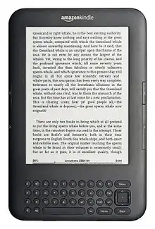 E-readers can hold thousands of books limited only by their memory and use the same physical space as a conventional book. Most E-ink displays are not back-illuminated and therefore seem to cause no more eye strain than a traditional book and less eye strain than LCD screens, with a longer battery life.[38][39] Features such as the ability to adjust font size and spacing can help people who have difficulty reading or dyslexia. Some e-readers link to definitions or translations of key words.[40][41] Amazon notes that 85% of its e-reader users look up a word while reading.[42]