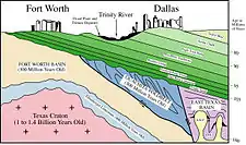 The Eagle Ford Group (also called the Eagle Ford Shale) is a sedimentary rock formation deposited during the Cenomanian and Turonian ages of the Late Cretaceous over much of the modern-day state of Texas. The Eagle Ford is predominantly composed of organic matter-rich fossiliferous marine shales and marls with interbedded thin limestones. It derives its name from outcrops on the banks of the West Fork of the Trinity River near the old community of Eagle Ford,[1] which is now a neighborhood within the city of Dallas. The Eagle Ford outcrop belt trends from the Oklahoma-Texas border southward to San Antonio, westward to the Rio Grande, Big Bend National Park, and the Quitman Mountains of West Texas.[2] It also occurs in the subsurface of East Texas and South Texas, where it is the source rock for oil found in the Woodbine, Austin Chalk, and the Buda Limestone,[3] and is produced unconventionally in South Texas and the "Eaglebine" play of East Texas.[4] The Eagle Ford was one of the most actively drilled targets for unconventional oil and gas in the United States in 2010,[5] but its output had dropped sharply by 2015.[6] By the summer of 2016, Eagle Ford spending had dropped by two-thirds from $30 billion in 2014 to $10 billion, according to an analysis from the research firm Wood Mackenzie. This strike has been the hardest hit of any oil fields in the world. The spending was, however, expected to increase to $11.6 billion in 2017. A full recovery is not expected any time soon.[7]
