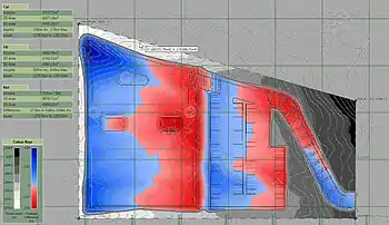 Earthwork software is generally a subset of CAD software, in which case it often an add-on to a more general CAD package such as AutoCAD.[3] In that case, earthwork software is principally used to calculate cut and fill volumes which are then used for producing material and time estimates. Most products offer additional functionality such as the ability to takeoff terrain elevation from plans (using contour lines and spot heights); produce shaded cut and fill maps; produce cross sections and visualize terrain in 3D.[4] The means by which volumes are calculated in software can differ quite considerably leading to potentially different results with the same input data. Many software products use methods based on triangulated irregular networks (TINS) and triangular prism volume algorithms, however other calculation methods are in use based on rationalizing elevations into high density grids or cross-sections.[5][6][7]