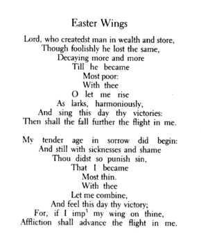 Easter Wings is a poem by George Herbert which was published in his posthumous collection, The Temple (1633). It was originally formatted sideways on facing pages and is in the tradition of shaped poems that goes back to ancient Greek sources.