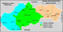 Map showing the distribution of the Western, Central and Eastern dialects of Slovak