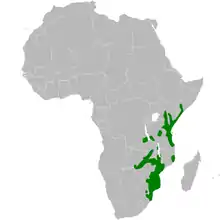 The eastern nicator (Nicator gularis) is a species of songbird in the family Nicatoridae. It is found in Kenya, Malawi, Mozambique, Somalia, South Africa, Swaziland, Tanzania, Zambia, and Zimbabwe. Its natural habitats are subtropical or tropical dry forests, dry savanna, and subtropical or tropical moist shrubland. It occurs south to around Mtunzini in northern KwaZulu-Natal, South Africa, and is regularly reported from lowland areas north through to east Africa, including inland areas along the Zambezi River.[2]