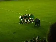 During the 1940 New Year's Day match, Easter Road was covered with a thick fog that would normally cause a football match to be abandoned.[36] Due to the match being played during wartime, and it being broadcast widely by the BBC for the entertainment of soldiers stationed overseas, the War Office ordered play to go ahead to avoid alerting the Luftwaffe to the bad weather conditions.[36] Commentator Bob Kingsley could not see the pitch either and had to improvise.[36] Using a series of runners to tell him if there were any goals scored, he created his own version of the match.[36][37] This was later described in The Scotsman as "Fawlty Towers ahead of itself" and adapted into a BBC Radio Four play by Scottish playwright, Andrew Dallmeyer.[37]