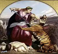 Probably the best known of these is Armitage's huge imperialistic painting, Retribution, in which he allegorized the suppression and punishment of the Indian 'Mutiny' by Great Britain in 1857. This was painted after details of the massacre of British soldiers, women and children had been circulated by the press. The Illustrated London News of 1859 described Retribution thus: "Britannia, represented of colossal proportions, has seized the assassin tiger by the throat, and is about to plunge her sword into its heart ... The melancholy results of the mutiny, which have spread mourning through so many homes, are typified in the figures of prostrate victims, with debris of books, etc., scattered around."