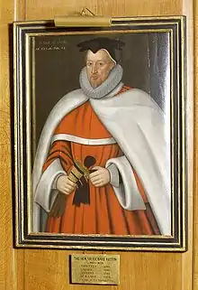 Next day, 6 February, Bromley was appointed a Baron of the Exchequer in place of Edward Heron, who had died after serving only a little over two years.[35] The Barons were judges in the Exchequer of Pleas, a court which dealt with important equity cases. He was the third in his family to be "adorned with the judicial ermine," after Chief Justice Thomas Bromley, and the Lord Chancellor. When he went to the Exchequer on his first day of service, wearing his judge's ermine, the entire available membership of the Inner Temple and the Inns of Chancery preceded him on foot.[34] On 26 February he was knighted at the Palace of Whitehall.[36] Bromley held his post at the Exchequer until his death, serving for all but the last year under Sir Lawrence Tanfield, the Chief Baron of the Exchequer, and sitting alongside Denham from 1617.[37] Bromley and Denham had their patents renewed on the accession of Charles I in March 1625.[38] Tanfield died a month after being reappointed and was replaced by Sir John Walter.[39]