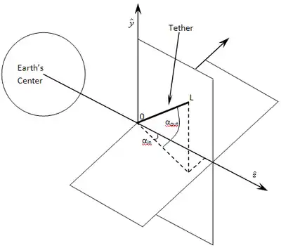 where the angle τ is between the length vector (L) of the tether and the electric field vector (E), assumed to be in the vertical direction at right angles to the velocity vector (v) in plane and the magnetic field vector (B) is out of the plane.