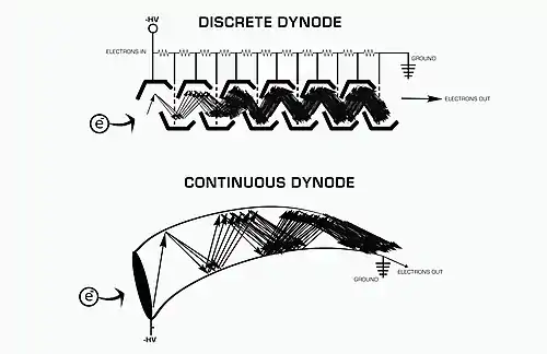 A continuous dynode system uses a horn-shaped funnel of glass coated with a thin film of semiconducting materials. The electrodes have increasing resistance to allow secondary emission. Continuous dynodes use a negative high voltage in the wider end and goes to a positive near ground at the narrow end. The first device of this kind was called a Channel Electron Multiplier (CEM). CEMs required 2-4 kilovolts in order to achieve a gain of 106 electrons.