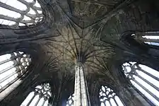 In June 1390, Alexander Stewart, Robert III's brother, burned the cathedral, manses and burgh of Elgin. This fire was very destructive, requiring the central tower to be completely rebuilt along with the principal arcades of the nave. The entire western gable between the towers was reconstructed and the main west doorway and chapterhouse were refashioned.[100] The internal stonework of the entrance is late 14th or early 15th century and is intricately carved with branches, vines, acorns and oak leaves.[96] A large pointed arch opening in the gable immediately above the main door contained a series of windows, the uppermost of which was a circular or rose window dating from between 1422 and 1435. Just above it can be seen three coats of arms: on the right is that of the bishopric of Moray, in the middle are the Royal Arms of Scotland, and on the left is the armorial shield of Bishop Columba Dunbar (Fig. 11).[96] The walls of the nave are now very low or even at foundation level, except one section in the south wall which is near its original height. This section has windows that appear to have been built in the 15th-century to replace the 13th-century openings: they may have been constructed following the 1390 attack (Fig. 12).[101] Nothing of the elevated structure of the nave remains, but its appearance can be deduced from the scarring seen where it attached to the eastern walls of the towers. Nothing of the crossing now remains following the collapse of the central tower in 1711.[99] Elgin Cathedral is unique in Scotland in having an English style octagonal chapterhouse and French-influenced double aisles along each side of the nave; in England, only Chichester Cathedral has similar aisles.[102][103] The chapterhouse, which had been attached to the choir through a short vaulted vestry, required substantial modifications and was now provided with a vaulted roof supported by a single pillar (Figs. 13 & 14). The chapterhouse measures 10.3 metres (34 ft) high at its apex and 11.3 metres (37 ft) from wall to opposite wall; it was substantially rebuilt by Bishop Andrew Stewart (1482–1501), whose coat of arms is placed on the central pillar.[67] Bishop Andrew was the half-brother of King James II.[104] The delay in the completion of these repairs until this bishop's episcopacy demonstrates the extent of the damage from the 1390 attack.[105]