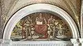 Government. Mural, Lobby to Main Reading Room, Library of Congress Thomas Jefferson Building, Washington, D.C. Main figure is seated atop a pedestal ("GOVERNMENT") holding a tablet with "A GOVERNMENT / OF THE PEOPLE / BY THE PEOPLE / FOR THE PEOPLE".