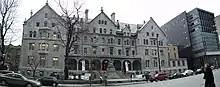 The Elizabeth Wirth Music Building (formerly the New Music Building) is one of two buildings belonging to the Schulich School of Music at McGill University, the other being the Strathcona Music Building directly adjacent to it. The building is located at 527 Sherbrooke Street West, on the corner of Sherbrooke and Aylmer Street in Montreal, Quebec and was designed in 2005 by the Montreal-based architectural firm Saucier + Perrotte.[3] The building officially opened in 2006,[1] and its construction was made possible through a donation of C$20 million from McGill alumnus Seymour Schulich to the Schulich School of Music.[2] The building was officially inaugurated as the Elizabeth Wirth Music Building on April 30, 2015, after the School received a donation of C$7.5 million from McGill alumna Elizabeth Wirth.[4][5]